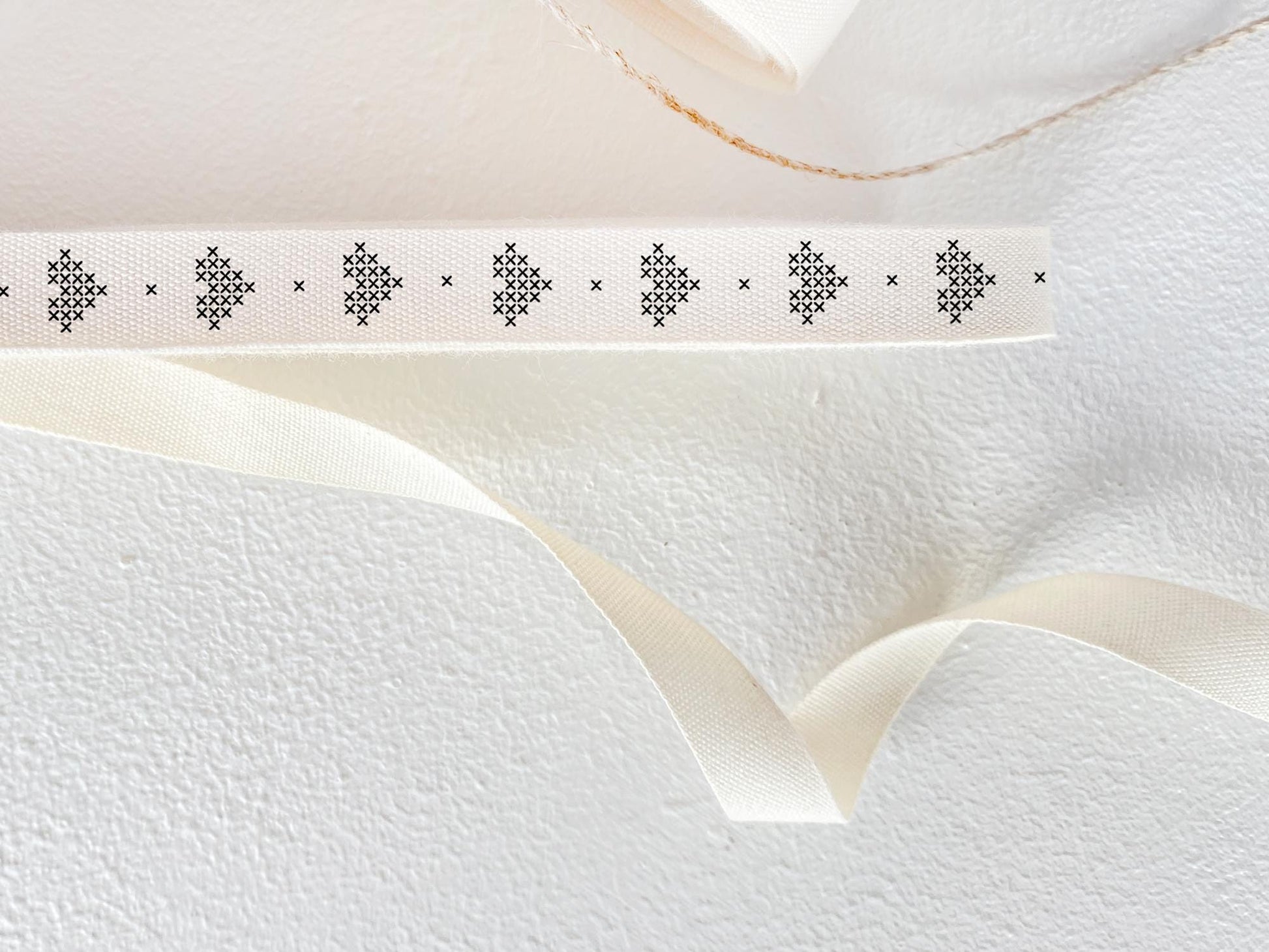 Crafted from 100% natural cotton, this woven ribbon is soft, durable, and eco-friendly. The printed black cross-stitch pattern mimics embroidery, adding a handmade touch to any project.