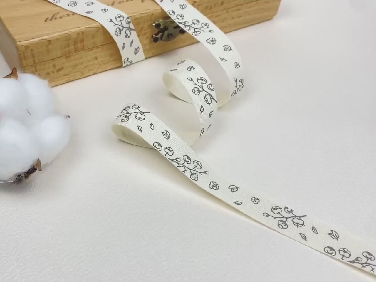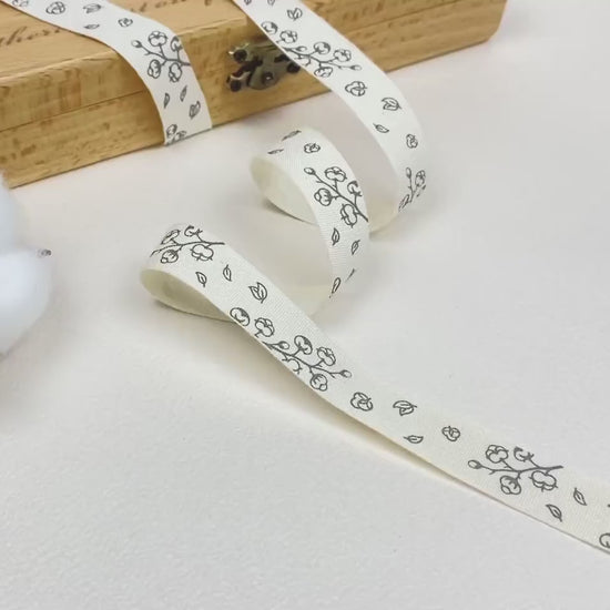 Celebrate the essence of natural living with our cotton plant printed ribbon. This delicate illustration in black on an off-white base is woven from 100% natural cotton-perfect for organic packaging, handmade textiles, and thoughtful baby gifts. A beautiful nod to the world of nature and softness.