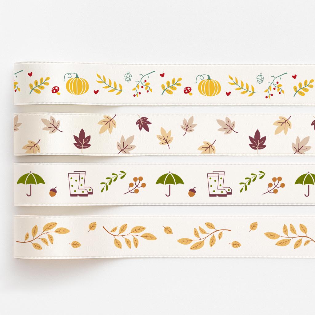 Perfect for fall gift wrapping, autumn wreaths, and Halloween or Thanksgiving table decor, this set includes four charming cream satin ribbons, each 3/4" (20 mm) wide and 5 yards long. Featuring playful pumpkins, rustic autumn leaves, whimsical rain boots & umbrellas, and elegant golden branches, this ribbon set brings variety and seasonal charm to all your autumn crafts.