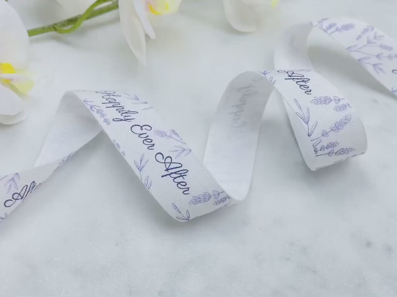 Celebrate love with this elegant "Happily Ever After" printed ribbon. Woven from 100% natural cotton, this soft white ribbon with delicate lavender accents adds a dreamy, romantic finish to wedding gifts, event tables, or bridal favors.
