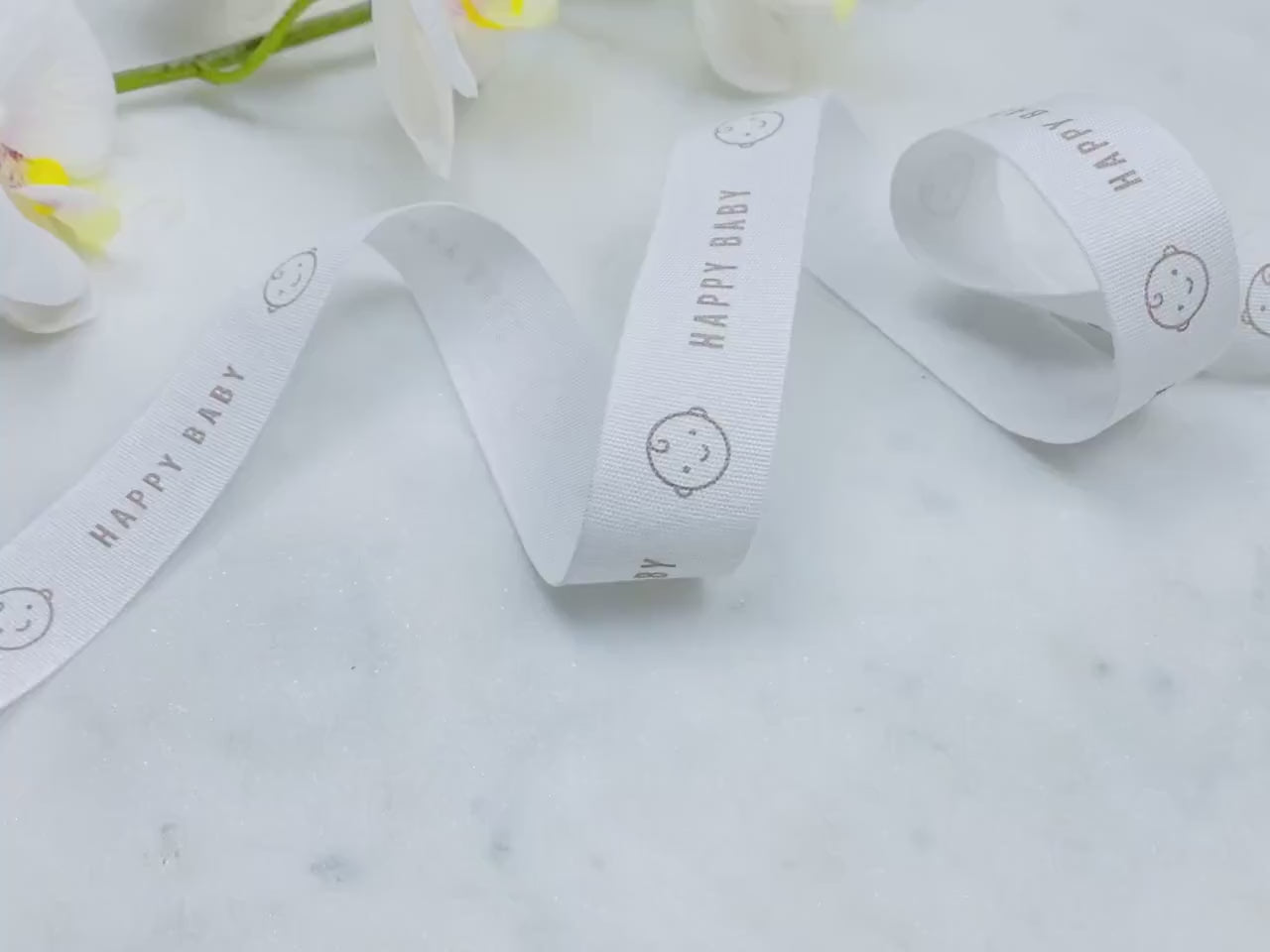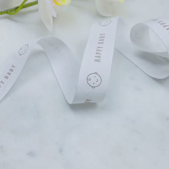 Celebrate the little one with our soft white cotton ribbon, delicately printed with a sweet "Happy Baby" message and baby face icons. Crafted from 100% natural cotton, it's perfect for wrapping newborn gifts, decorating baby shower favors, or enhancing organic baby textiles.