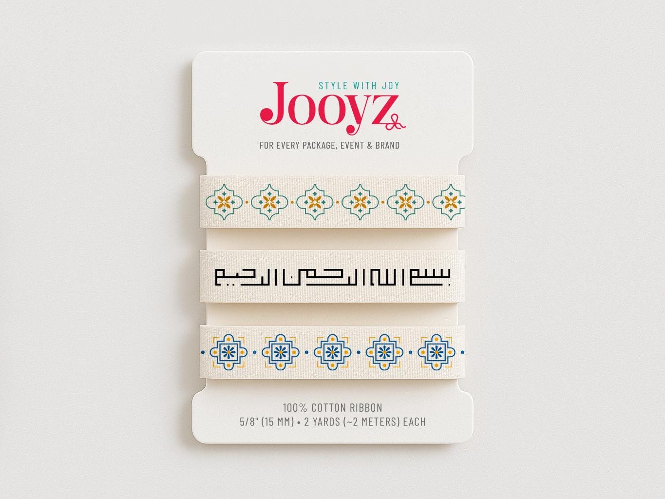Add an elegant and meaningful touch to your packaging with this 3-pack Islamic cotton ribbon set. Made from 100% natural cotton, each ribbon features a unique design: Bismillah calligraphy in bold Kufic style, intricate Islamic geometric patterns, and Arabic-inspired motifs. Perfect for Eid gifts, Ramadan packaging, and Arabic wedding favors.