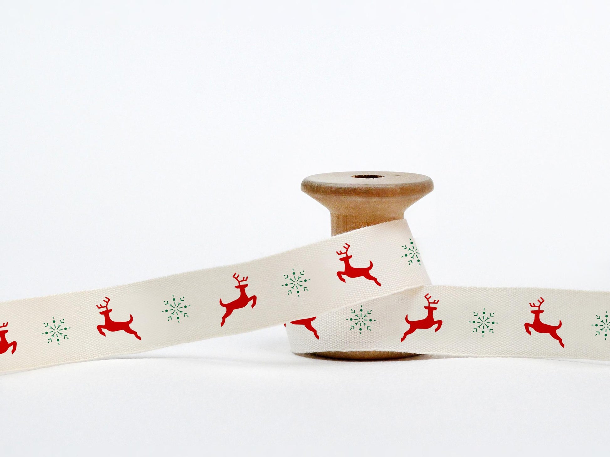 Elevate your holiday decorations with our distinctive ribbon, adorned with red reindeer and green snowflakes, all beautifully displayed on 100% natural cotton.