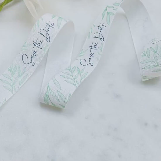 Announce your special day with natural charm using our "Save the Date" printed ribbon. Crafted from 100% white cotton, this botanical-themed ribbon with soft green leaves adds a rustic and organic elegance to your wedding invites, favors, or event gifts.