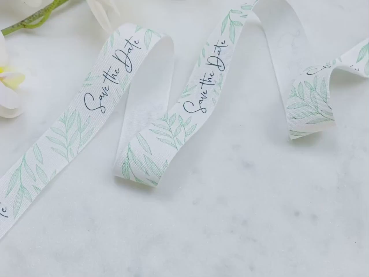 Botanical Wedding Touch: "Save the Date" Cotton Ribbon with Leafy Green Design